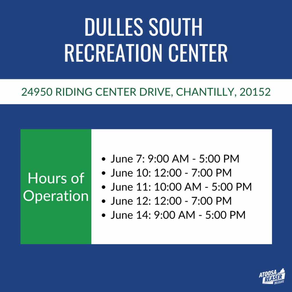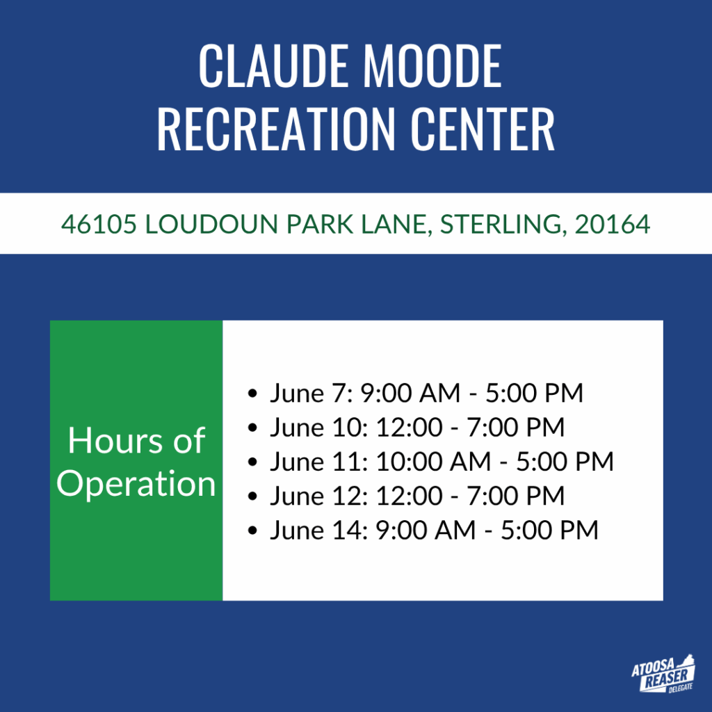 Beginning this weekend, in-person early voting is being expanded to satellite locations at Claude Moore Park and Dulles South Recreation Center. Below is information on locations, dates, and hours of operation.