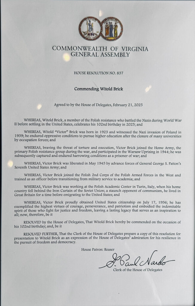 On Wednesday, I had the distinct pleasure of presenting House Resolution 837 to Witold “Victor” Brick. Mr. Brick is an embodiment of courage, bravery, and heroism.