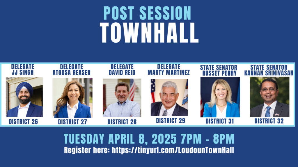 On April 8, 2025, members of the Loudoun General Assembly Delegation will hold a virtual town hall to hear from our constituents and discuss the 2025 Legislative Session, key pieces of legislation and budget items, and important issues facing our county and Commonwealth. This is an excellent opportunity to speak with your state representatives regarding what you care about the most. Please RSVP using the button below: