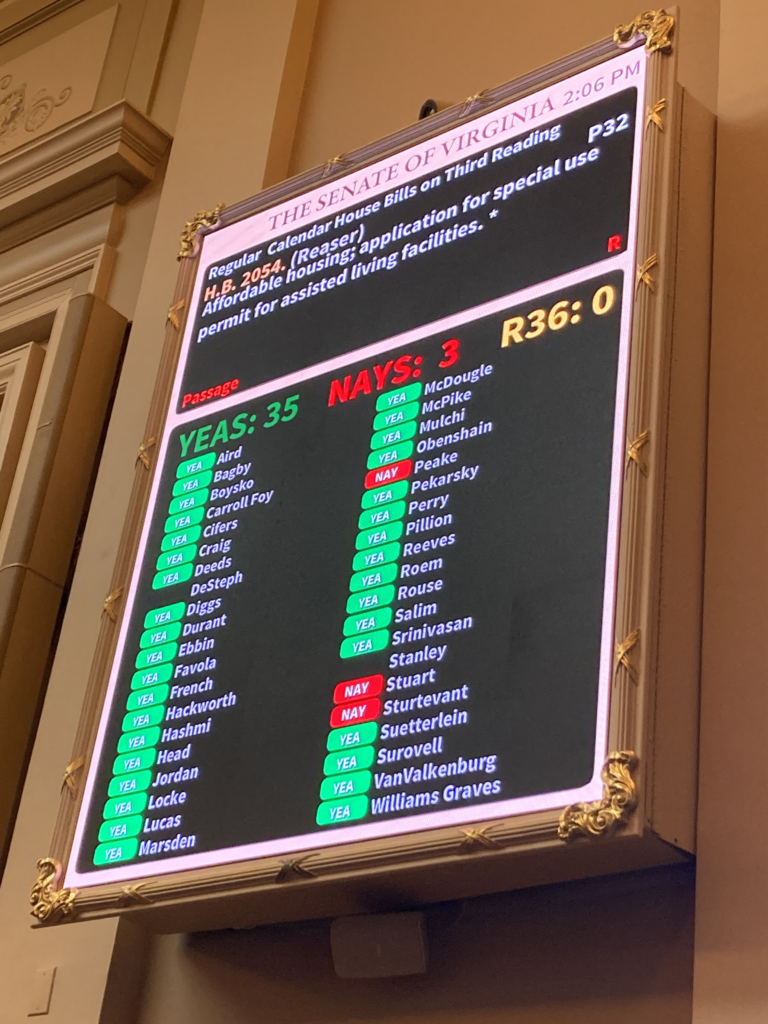 House Bill 2054: Our seniors need affordable assisted living, and this bill empowers localities to negotiate for it. This bill has passed out of the General Assembly on a 35-3 vote in the Senate!