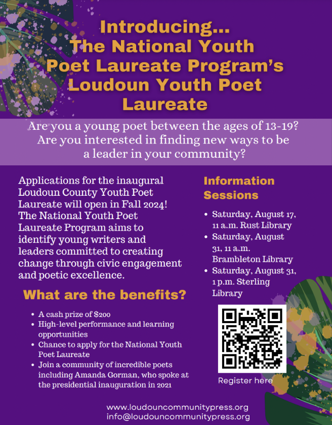Applications for the first Loudoun County Youth Poet Laureate will open in Fall 2024! The National Youth Poet Laureate Program aims to identify young writers and leaders who are dedicated to creating change through civic engagement and poetic excellence. The Loudoun Community Press partners with Urban Word for the Youth Poet Laureate program in Virginia.
