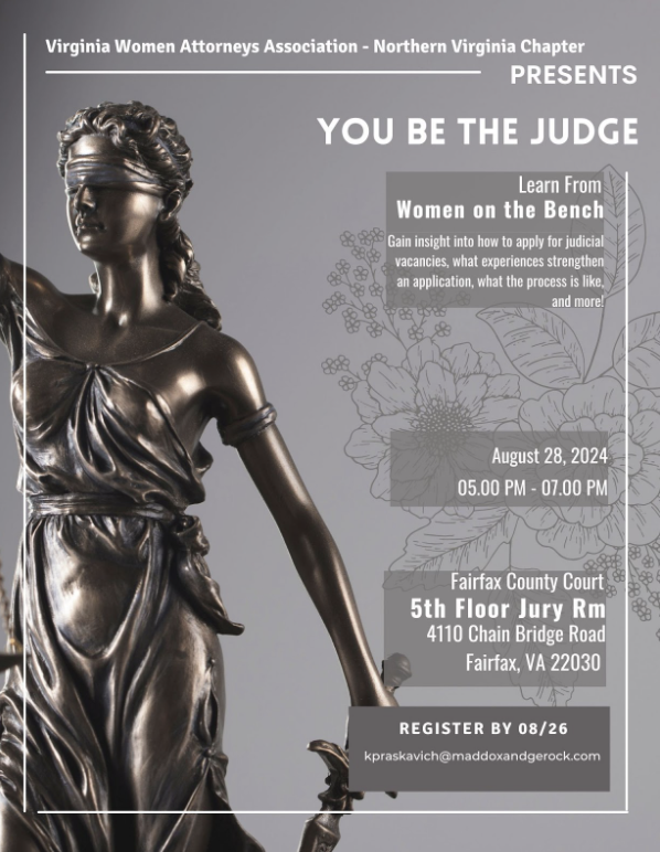 Interested in being a judge in Loudoun one day? Join the Northern Virginia Chapter of the VWAA on August 28, 2024, from 5:00-7:00 PM at the 5th Floor Jury Room, Fairfax County Courthouse (4110 Chain Bridge Road, Fairfax, VA) for valuable insights into applying for judicial vacancies, tips to strengthen your application, and the chance to meet women judges.