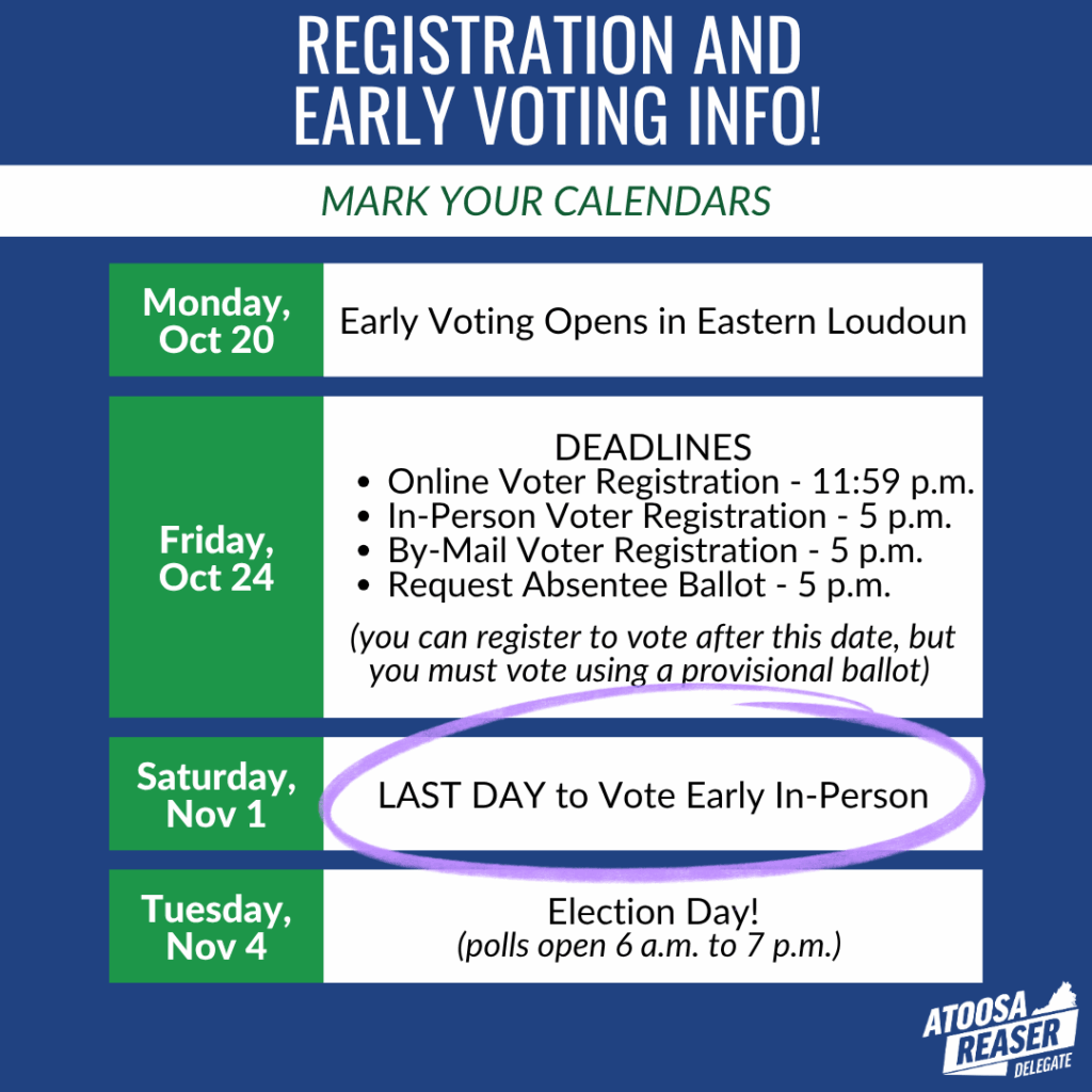 Check polling locations, hours, and do not forget to bring a valid ID. For more information, visit the Loudoun County elections website. Do not wait-make your plan to vote early!