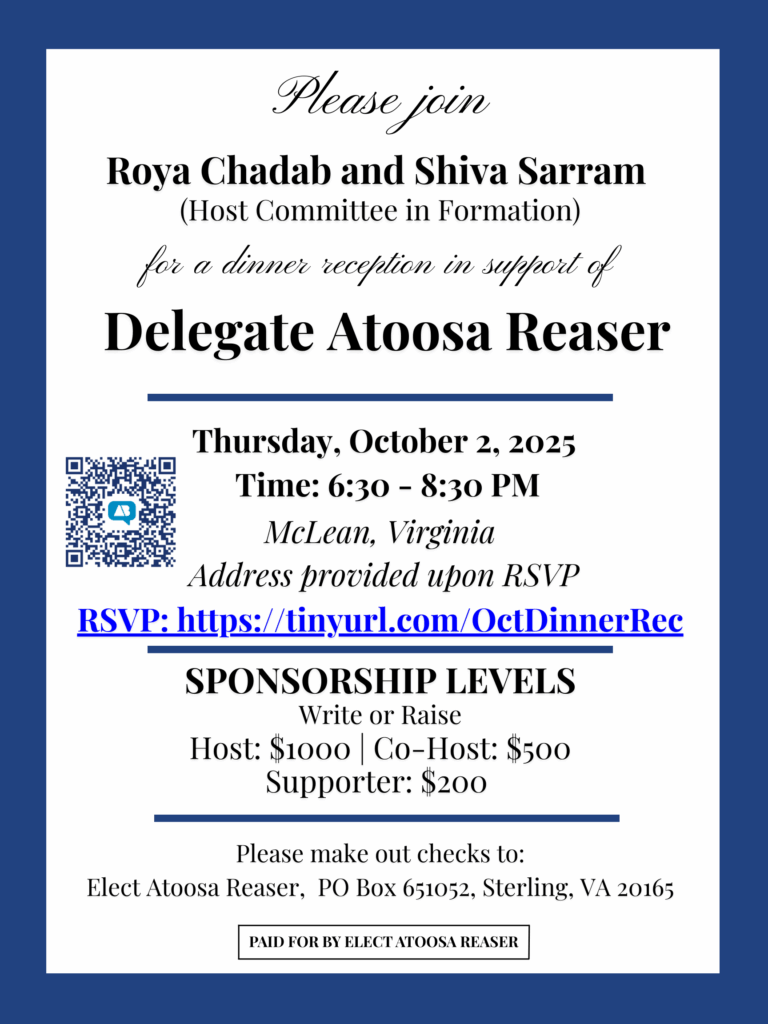 As we enter the final stretch of the 2025 elections, I hope you will join me next week for a dinner reception with my friends Roya Chadab and Shiva Sarram. We are seeking one last push to secure the necessary funds for campaign communications, purchasing walk literature, and supporting candidates in battleground seats across Virginia. Together, we will enjoy an evening of fellowship, community, and excellent food as we gather energy for the final push to Election Day.