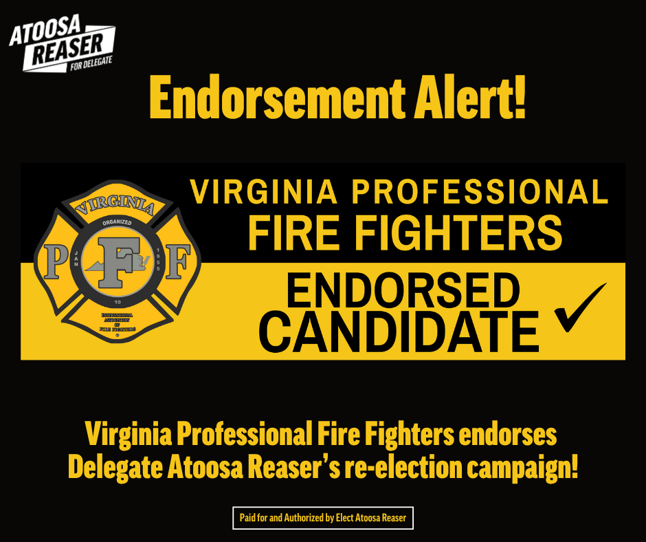 I am honored to have the endorsement of the Virginia Professional Fire Fighters. I am proud to stand with them in the fight for fair pay, strong benefits, and safe working conditions!