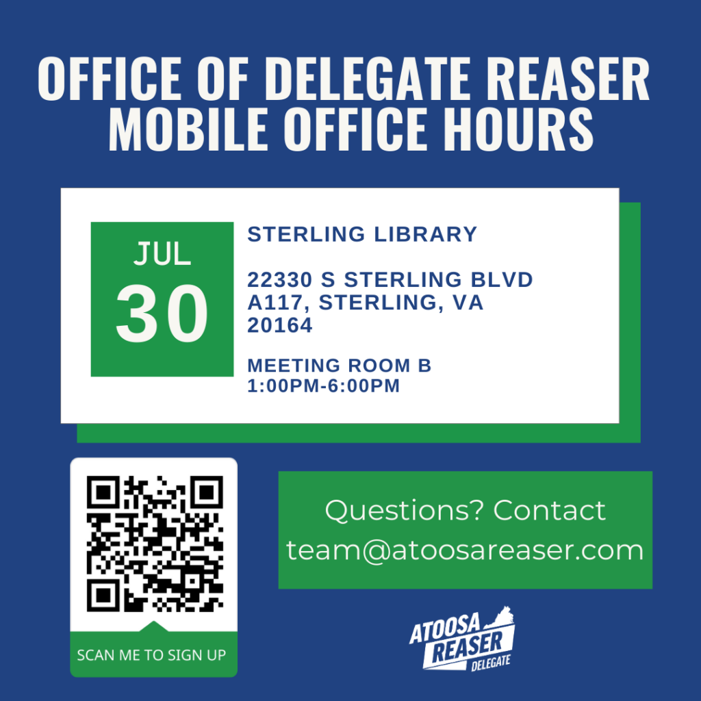 Attention HD-27 residents! Our rotating mobile office hours continue. Please register for your time slot on July 30th from 1:00 PM to 6:00 PM at Sterling Library, where our office can help you address issues with state agencies, discuss legislation, or hear your community’s concerns and feedback! Looking forward to seeing you there!