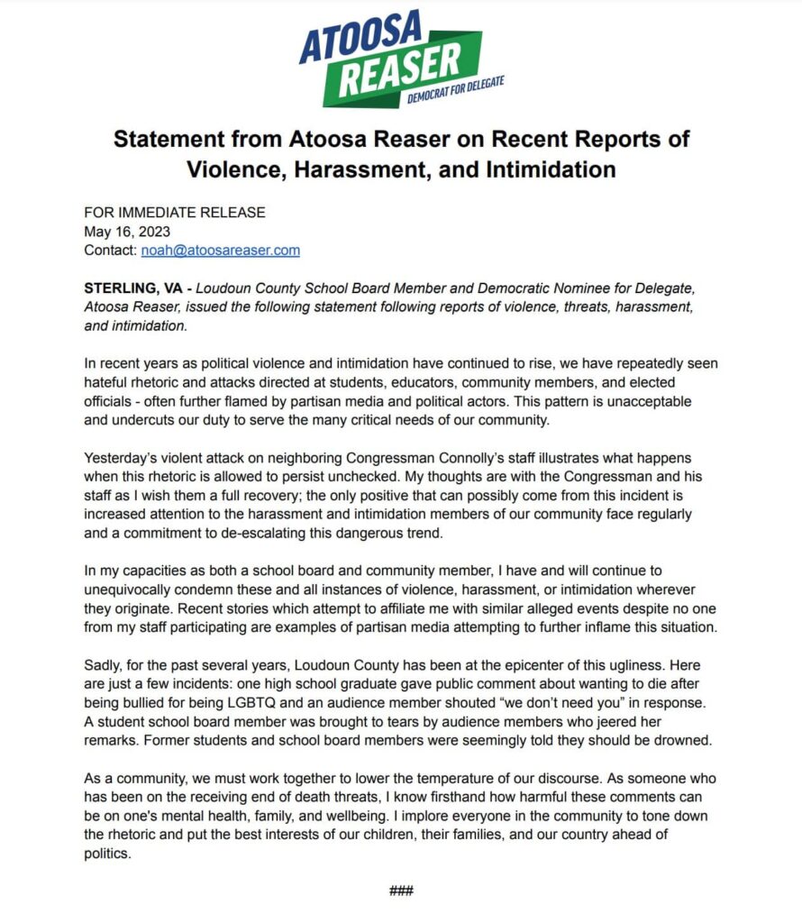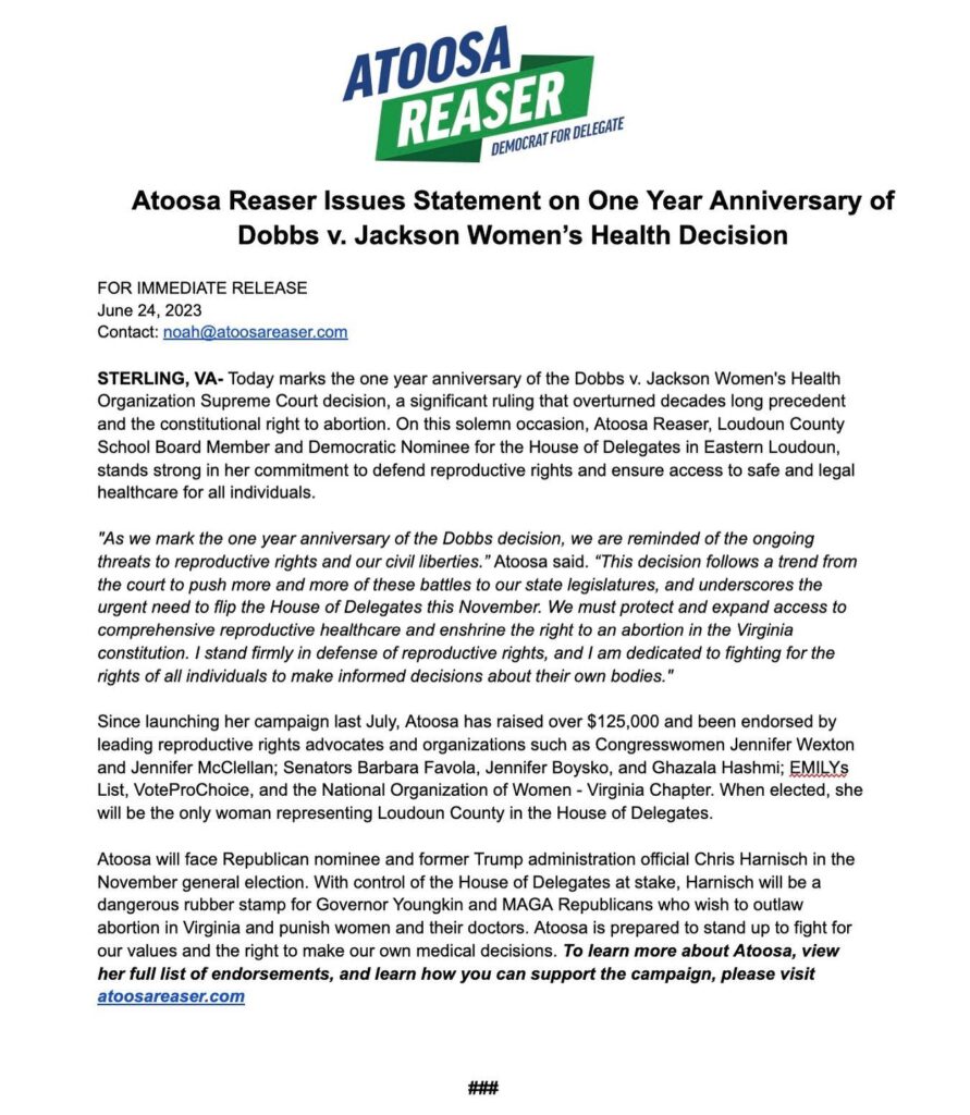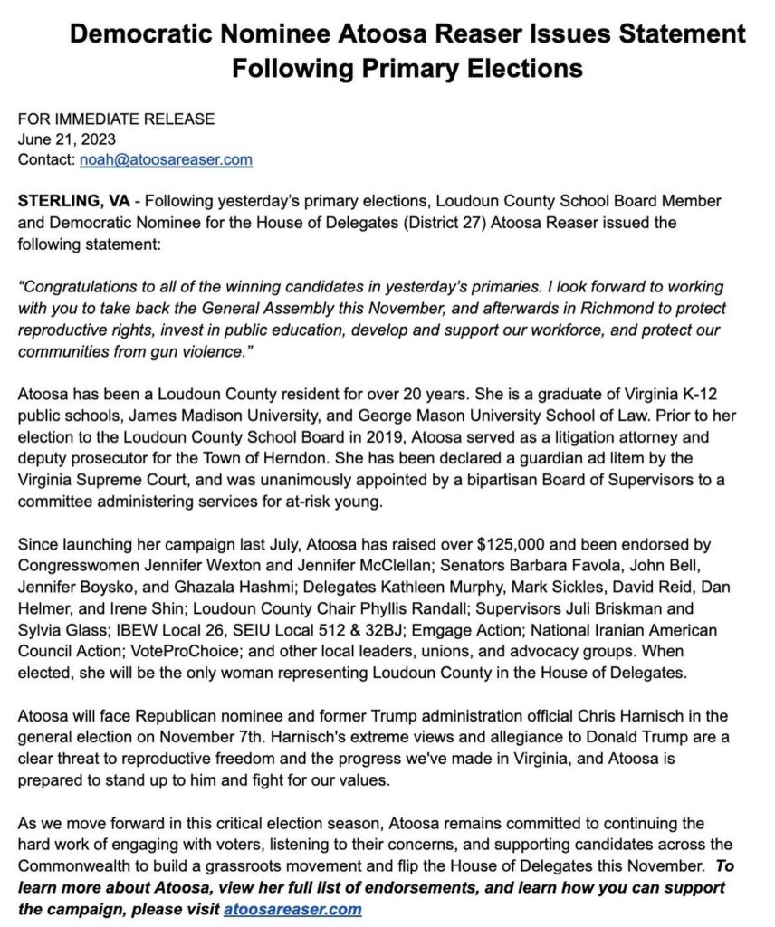 The Loudoun County Democratic Committee announced yesterday that Atoosa Reaser has been declared the Democratic nominee in District 27 of the Virginia House of Delegates. Her record of service and message of inclusivity, fairness, and justice resonated with voters across the district, and her commitment to fighting for working families,
