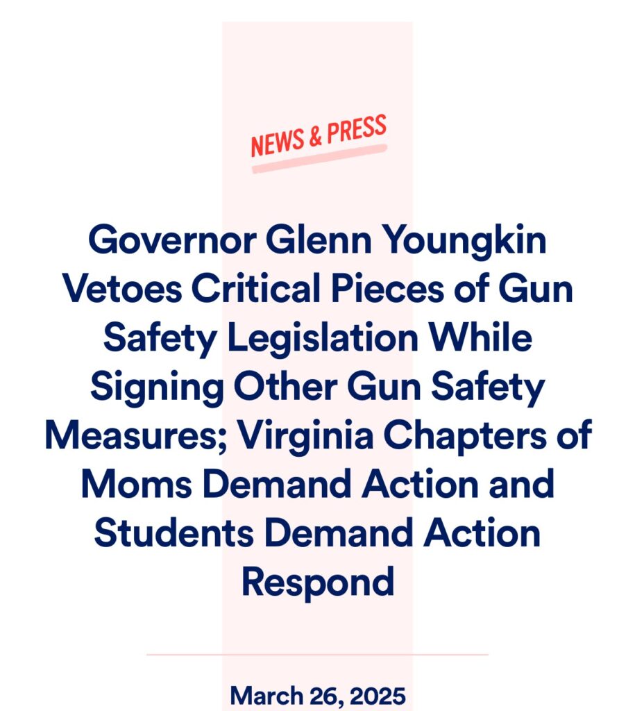 RICHMOND, Va. – The Virginia chapters of Moms Demand Action and Students Demand Action, both part of Everytown for Gun Safety’s grassroots network, issued the following statements after Governor Youngkin vetoed several significant gun safety policies for the second year in a row, including those to ban the sale and public