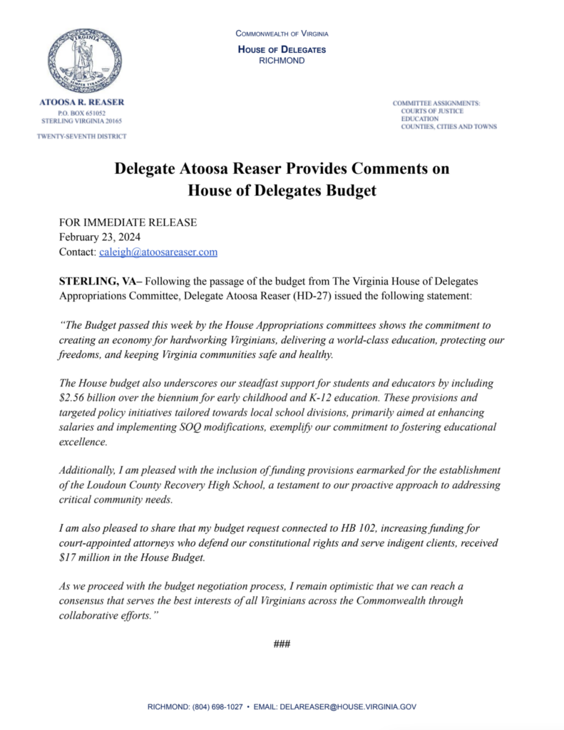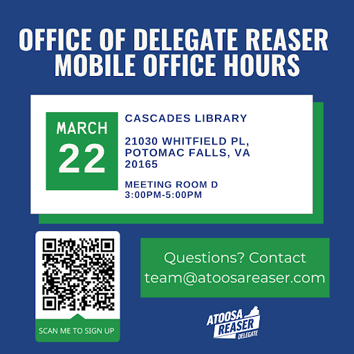 Being back In Loudoun, speaking with community members, and hearing your thoughts on this year’s General Assembly Session and the broader public issues, enables me to best represent the district. The feedback you provide is critical for successful public service and I hope the information provided in this week’s outreach