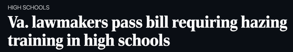 Virginia legislators have passed a bill requiring hazing awareness and prevention training at public high schools. The House passed Senate Bill 379 by a vote of 56-44 on Monday, with all 51 Democrats and five Republicans voting in support. The Senate unanimously approved it earlier this month. It comes two years after Virginia